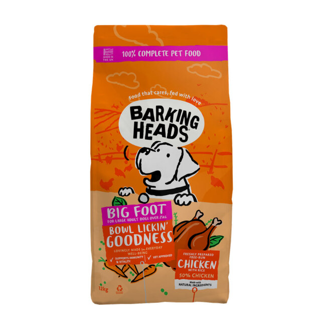 Barking Heads koera täissööt Big Foot Bowl Lickin Goodness kanaga. Täissööt täiskasvanud suurt tõugu koertele, kes kaaluvad üle 25 kg.