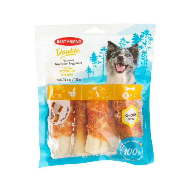 Best Friend Double närimisrullid veisenahast ja kanafileest. Kanafileega topeltnärimisrullid on kergesti seeditavad, valgurikkad ja madala rasvasisaldusega. Närimistoodete regulaarne kasutamine aitab hoida hammaste ja igemete tervist ning vältida halba hingeõhku. Närimistooted pakuvad ka suurepärast meelelahutust ja kosutavad tõhusalt teie koera, stimuleerides samal ajal loomulikku närimisinstinkti.