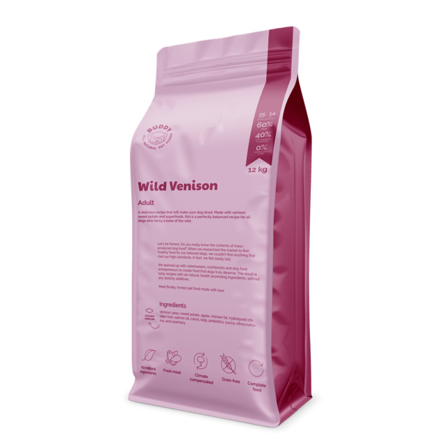 Buddy kuivtoit koertele hirvelihaga. Täissööt täiskasvanud koertele, sobib ka tundliku seedimisega koertele. Valmistatud kompromissitu seguna, mis sisaldab 60% kvaliteetset hirveliha ning 40% toitvaid köögivilju, puuvilju ja supertoite. See täissööda retsept pakub maitseelamust ja toitainelist tasakaalu, mis on eriti õrn nii seiklushimulisele kui ka tundlikule koerale.