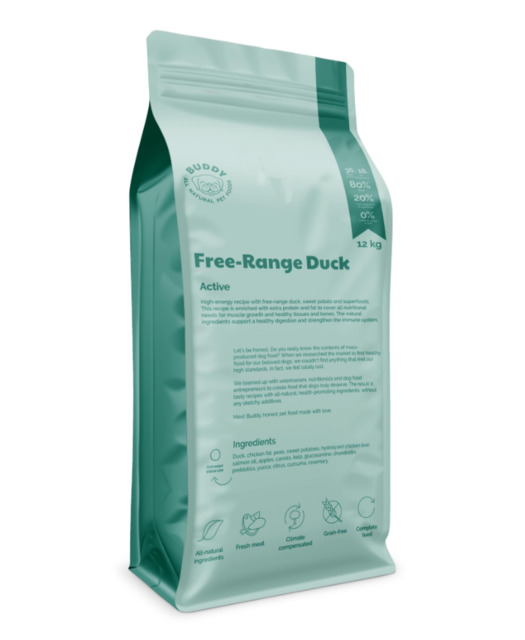 Buddy kuivtoit koertele pardilihaga. Täissööt suurtele ja aktiivsetele koertele. See kuivtoit sisaldab värsket pardiliha, bataati ja supertoite, et tagada kõik vajalikud toitained lihaste kasvuks, tervete kudede ja luude toetamiseks.