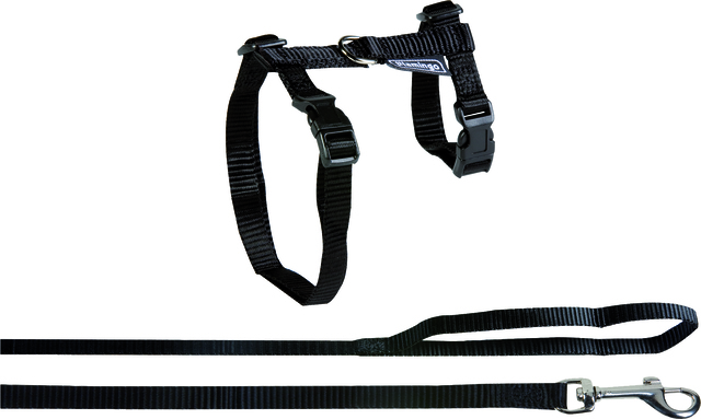 Musta värvi trakside ja jalutusrihma komplekt suurele kassile.