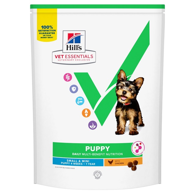 Hill’s Vet Essentials Multi-Benefit Small & Mini Puppy täistoit kanaga on mitme kasuteguriga lemmikloomatoit väikest tõugu kutsikatele (täiskasvanud kaal kuni 10 kg), sobib vanuses 4 nädalat kuni 12 kuud ning tiinetele või imetavatele koertele. See tagab täpse toiteväärtusliku tasakaalu, mis sisaldab energiat, valku, vitamiine ja mineraalaineid + ainulaadset prebiootilist segu.