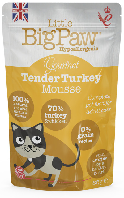 Little Bigpaws kassi pasteet kalkuniga. Tegemist on täissöödag. 100% naturaalne ning 70% liha. Teraviljavaba ja hüpoallergeenne. Valmistatud maitsvast värskest kalkunilihast – väga toitev, kergesti seeditav tailiha. Vajalikud vitamiinid ja mineraalid: Sealhulgas A, D ja E, mis tagavad terve immuunsüsteemi ning tugevad hambad ja luud. Oomegaõlid ja -rasvad: Vajalikud rasvhapped suurepärase naha, liigeste hoolduse ja suurepärase läikiva karvkatte jaoks.