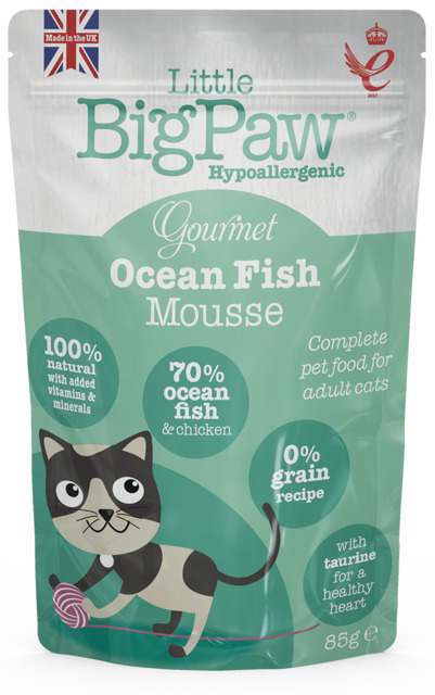 Little Bigpaws kassi pasteet ookeanikalaga. Tegemist on täissöödag. 100% naturaalne ning 70% liha. Teraviljavaba ja hüpoallergeenne. Maitsev ookeanikala – väga toitev, kergesti seeditav ja rikas oomega-õlide poolest. Vajalikud vitamiinid ja mineraalid: Sealhulgas A, D ja E, mis tagavad terve immuunsüsteemi ning tugevad hambad ja luud. Oomegaõlid ja -rasvad: Vajalikud rasvhapped suurepärase naha, liigeste hoolduse ja suurepärase läikiva karvkatte jaoks. Tauriin: Oluline terve südame ja hea nägemise jaoks.